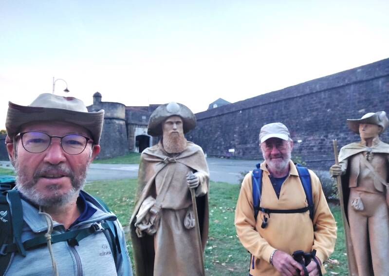 affichés ci-dessus : nous avons désormais fait plus de la moitié du chemin. Ce matin au lever du jour, nous laissons la ville fortifiée de Navarrenx en franchissant la porte Saint-Antoine. Devant cette belle porte de la ville, nous posons pour un selfie devant 2 statues en résine. L'une représente un pèlerin et l'autre un habitant de la ville au moyen âge qui montre le chemin à suivre. Nous prenons donc la route indiquée. Un peu plus tard, nous traversons le village de Castelnau-Camblong pour ensuite prendre un chemin à travers une forêt dans laquelle nous verrons les fameuses palombières du Sud-Ouest. Le chemin continue et nous arrivons au carrefour de Lacorne situé sur le plateau. Nous y trouvons l'établissement de Jean Haget, il est producteur de gastronomie gasconne et il a installé un abri pour les pèlerins. Nous y prenons le café et en profitons pour acheter des pâtés (palombe, canard, lièvre, volaille) qui agrémenteront nos prochains apéros. Dans la conversation, il nous indique qu'ici nous avons un pied en Béarn et un pied au pays Basque. En repartant, nous avons des vues magnifiques avec en fond, les sommets pyrénéens qui se rapprochent. La deuxième partie de la matinée se fait en majorité sur le bitume à travers la campagne avec par ci par là encore des champs de maïs. Sur la fin, une descente à travers un sous-bois nous fait rejoindre la départementale 11. Soudain, un coup de klaxonne nous fait nous retourner. Dominique et Pascale nous saluent en nous doublant. Elles vont être à la bourre pour préparer le déjeuner... Nous rejoignons la ferme gîte Bohotéguia qui nous a gentiment autorisé à stationner le camping-car sur leur site. Pascale et Dominique nous ont préparé, en temps et en heure, un bon confit de canard avec des frites... pour le dessert, il se compose de glaces achetées à l'épicerie du gîte. Simone et Manu, les propriétaires du gîte, nous offrent le campement, nous nous devons d'acheter des produits dans leur épicerie. Il va sans dire que nous irons en fin de soirée prendre l'apéritif au gîte. En attendant, cette après-midi est consacrée à un repos bien mérité après les 120 kilomètres de ces 4 derniers jours. Demain, les sommets pyrénéens seront encore plus près et mercredi nous serons à Saint-Jean-Pied-de-Port.