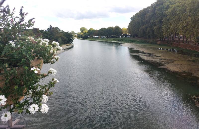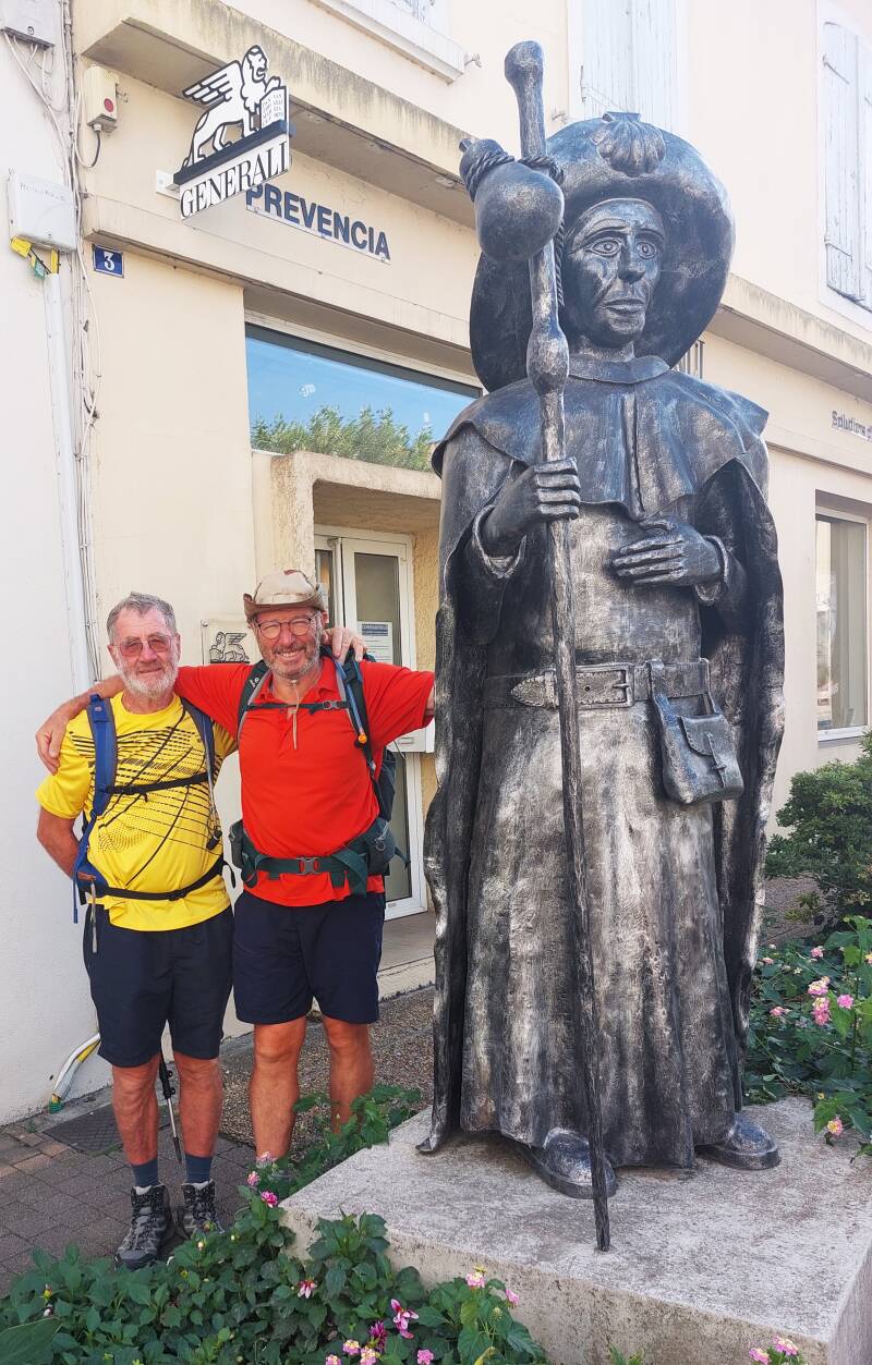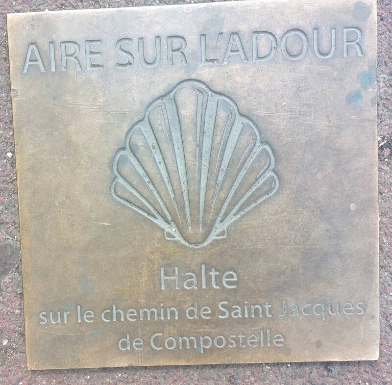 Aujourd'hui nous quittons le Gers et le Bas-Armagnac pour une arrivée dans le département des Landes. Dès la sortie de Nogaro, nous prenons un chemin pour retrouver les champs de maïs et de sorgho. Quelques kilomètres plus loin, ce sont de nouveau les vignes qui envahissent le paysage. Nous dépassons un couple de pèlerins déjà vu la veille et nous faisons connaissance avec un gars de Périgueux, qui, parti de Cahors fait sa dernière étape. Nous le reverrons à l'arrivée en train de boire une binouse car le bus qui devait l'emmener sur Mont-de-Marsan n'est pas passé. Après des kilomètres sans voir de maisons, nous arrivons au petit village de Lelin-Lapujolle pour la pause rafraîchissement. Nous reprenons le chemin à travers champs avec un arrêt pour regarder un couple de chevreuils traverser la route et le champ avec des bonds magistraux. Quelques minutes après, un aire pour les pèlerins nous attend avec table et chaises pour le déjeuner. Requinqués, les derniers kilomètres sont moins intéressants car nous marchons comme pour l'étape d'Eauze sur la piste d'une ancienne voie ferrée. Vers 14h, nous passons le panneau Aire-sur-l'Adour pour retrouver Pascale et Dominique à l'office du tourisme. Belle histoire avec cette ville, car lorsqu'au printemps nous avons reconnu le parcours pour stationner le camping-car ; j'avais récupéré deux coquilles Saint-Jacques à l'église Sainte Quitterie que nous portons sur notre sac à dos. Bien installés au camping les ombrages de l'Adour pour le dîner et la soirée, souhaitons que la nuit soit bonne car demain nous entamons un périple de trois étapes dépassant chacune les 30 kilomètres.