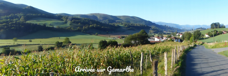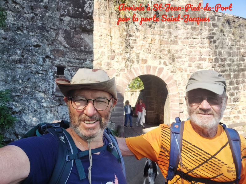 Pour notre dernière étape française, nous partons avec une température de 12°, mais très vite le soleil se lève dans un ciel bleu. Avec les trois voies qui se sont rejointes hier, il y a un peu plus de pèlerins sur le chemin, mais tout le monde y trouve sa place. Le parcours se fait en majorité sur du bitume, mais nous retenons plutôt le superbe cadre des montagnes pyrénéennes qui nous entoure. Arrivés à Bastida Choko, la route laisse place à un sentier qui après une sympathique grimpette nous amène à la croix de Galzetaburu. Quelques centaines de mètres en bord de départementale, nous plongeons sur le village de Gamarthe. Dans ce village, il y a un arrêt obligatoire au GAEC de Elizagaraia qui protège un cheptel de 500 brebis actuellement en Estives. Nous y trouvons le célèbre fromage fermier Ossau Iraty. Quand on vous le fait goûter, vous savez que c'est du vrai de vrai ; aussi nous repartons avec deux bons morceaux. Nous reprenons, une route qui s'élève et qui nous offre une solide grimpette afin de franchir franchir le col d'Oyhanzarre ; seule difficulté de la journée pour cette étape relativement facile. Nous redescendons ensuite sur Saint-Jean-le-Vieux, avec un arrêt à la sortie du village pour visiter la magnifique église de la Magdeleine du 14ème siècle. Après une prière commune, l'émotion commence à nous gagner ; nous sentons que nous arrivons au terme de notre première partie du parcours. Encore un kilomètre et voilà les premières maisons de Saint-Jean-Pied-de-Port. Nous entrons dans la ville par la porte Saint-Jacques du rempart médiéval inscrite au Patrimoine de l'Unesco, qui était jadis un péage. Nous descendons la rue de la Citadelle pour franchir ensuite le pont sur la Nive. Pour fêter cette fin du parcours français, on ne pouvait que s'arrêter en terrasse pour savourer notre binouze quotidienne. Nous gagnons ensuite l'aire de camping-car du Fronton pour y retrouver Pascale et Dominique qui nous attendent pour l'apéro. Nous ne pouvons que les féliciter, elles ont vraiment assuré pour la logistique. Stationner et faire les pleins et vidanges du camping-car, faire les courses et préparer les repas, faire les lessives pour que nous ayons toujours des vêtements propres : ça demande du temps et ce n'est pas toujours facile. Merci encore à toutes les deux, nous penserons à vous récompenser au retour. Cette après-midi, nous allons visiter la ville avant de terminer la journée dans la tranquillité pour bien préparer la première étape du Camino Francés. Le fromager nous a dit ce matin : "Je ne comprends pas les pèlerins qui arrêtent leur parcours à Saint-Jean-Pied-de-Port car l'étape suivante est l'une des plus belles, surtout quand on a la chance comme vous d'avoir un temps superbe." Certes, mais elle se mérite : 26 kilomètres dont les 19 premiers ne sont que de la montée pour passer de 200m à 1430m.