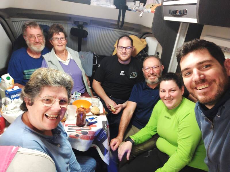 Lundi 24 octobre 2022 : 6h20. Bien que je sois dans un demi-sommeil, j’entends frapper à la porte du camping-car. Que se passe-t-il ? Est-ce le camping-car d’à côté qui a un problème, est-ce la Guardia Civil ou un SDF qui cherche un abri ? Je me lève pour aller ouvrir la porte et là c’est un moment d’émotion intense. Devant moi mes trois enfants, Jocelyn, Dorine et Joris qui me disent : « Bonjour, alors tu n’es pas prêt, on t’attend pour partir à Santiago de Compostela » Ce sont les larmes qui montent et des embrassades, quel bonheur de vivre ça et quel cadeau d’amour ils me font. Jo et Dominique qui sont encore dans leur lit n’en reviennent pas et se demandent eux aussi ce qui se passe. Seule Pascale était au courant de leur initiative. La surprise passée, nous nous serrons pour prendre le petit-déjeuner après une interprétation du chemin de papa remaniée par mes enfants. Le temps ensuite de nous habiller et de nous équiper, et c’est à cinq que nous prenons la route. Six cent mètres plus loin, nous rejoignons la borne du chemin indiquant vingt kilomètres. Pas de chance, les quelques gouttes précédentes se transforment en pluie et il nous faut enfiler pantalon et poncho. Heureusement la pluie n’est pas très forte, mais il faut quand même bien regarder où on pose les pieds, ce qui n’est pas toujours facile avec la seule lumière de la frontale. Nous marchons dans une bonne ambiance - il y a tellement de choses à raconter sur notre parcours – et les kilomètres défilent. Déjà huit effectués, il est temps de s’arrêter à San Paio pour la pause café-chocolat. Pas de napolitano en vitrine ce matin, il sera remplacé par des délicieuses parts de gâteau aux amandes et au chocolat. Mais l’étape n’est pas finie et il nous faut repartir à nouveau sous la pluie. C’est un peu dommage car le chemin est agréable. Passé les villages de Lavacolla et Vilamaior, nous arrivons dans la banlieue de Santiago-de-Compostela et la pluie s’arrête enfin. À six kilomètres de l’arrivée, nous sommes à l’Ermitage de San Marcos où nous retrouvons Dominique et Pascale, qui après avoir stationné le camping-car au camping As Cancelas, sont venues à notre rencontre. Nous sommes désormais à sept pour la fin de cette ultime étape. Après Monte do Gozo, c’est une descente qui nous amène à l’entrée de la ville. En passant devant le panneau, l’émotion est forte pour moi et Jo. Nous revoyons notre parcours avec les moments de joie qu’il nous a procuré, les instants de bonheur qu’il nous a donné, les difficultés qu’il a fallu surmonter et les moments difficiles à vivre. Les larmes sont là avec accolades et embrassades avec des mots qui disent « il ne faut garder que le meilleur et continuer à prier pour que nos efforts soient récompensés et nos demandes exaucées ; le meilleur est toujours à venir ». Il nous reste encore trois kilomètres à faire dans les rues de la ville et c’est une sensation étrange que l’envie de découvrir la cathédrale et son parvis. Et après quelques marches que nous descendons en tenant la main de nos épouses et le passage sous une voûte, là voilà, nous y sommes. Les nerfs lâchent, les sanglots montent, les fortes étreintes sont longues à se desserrer. Nous pensons à nos enfants, nos petits-enfants, nos familles et nos amis...sans oublier ceux qui ne sont plus là et qui nous ont suivi et encouragé depuis leurs étoiles. Après ce long moment d’exaltation pour célébrer la réussite de notre projet, nous prenons la pause devant cette cathédrale qui dégage une puissance de foi à vous rendre humble et tolérant. Ensuite c’est le passage obligé au bâtiment d’accueil des pèlerins pour la vérification de nos crédentiales et la délivrance de la Compostela (certificat de pèlerinage rédigé en latin) qui valide notre parcours sur le chemin. Pour fêter notre arrivée, la tradition sera respectée dans une auberge avec la traditionnelle et incontournable binouse suivie d’un déjeuner. Retour au camping où les enfants ont réservé leur bungalow pour une douche appréciée avant une soirée dîner au restaurant. Pour l’anecdote, Jocelyn a imité son parrain Christian, qui avait éclaté une chaussure en nous accompagnant pour le début de la première étape. En se garant ce matin pour la surprise, il s’est pris le trottoir mais n’a pas plus regardé que ça. Et Dominique en ramenant la voiture sur Santiago a du rouler à 50 km/h en se demandant ce qui se passait. Résultat : un pneu éclaté. Mais rassurez-vous, tout est rentré dans l’ordre dans l’après-midi grâce à Euromaster. Demain matin, retour en France pour les enfants qui m’ont donné aujourd’hui une preuve d’amour inestimable. Pour nous ce sera une journée de repos sur Santiago-de-Compostela pour visiter la ville et acheter des souvenirs. Nous réfléchissons sur les quatre étapes bonus pour aller à Fisterra car la météo annoncée n’est pas au top.