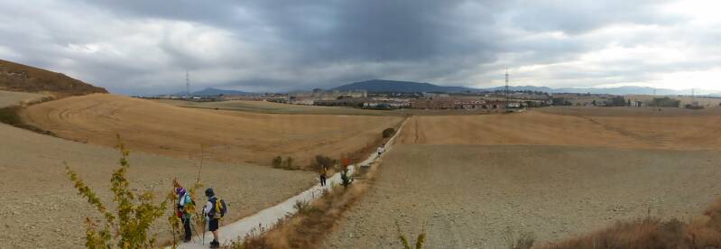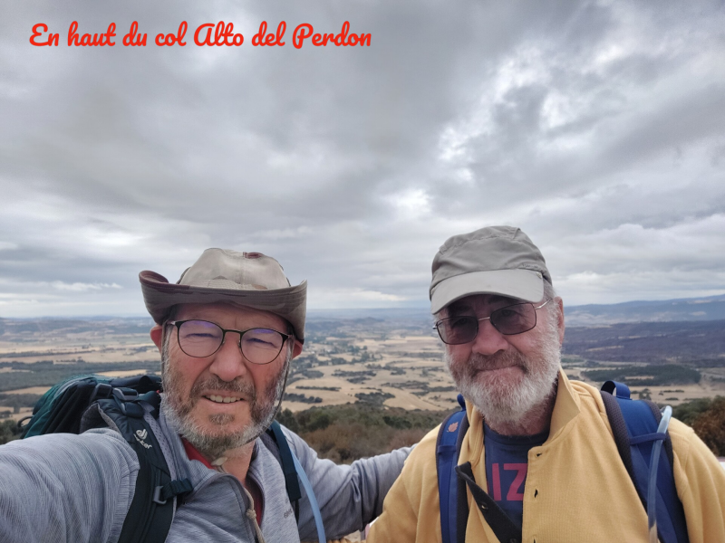 Ce matin, pour rejoindre le GR65, il nous faut marcher 3,5 kilomètres pour retrouver la cathédrale et les coquilles jaunes qui balisent le chemin. Ensuite, ce sont 4,5 kilomètres dans les rues de Pampelune avant de sortir de la ville pour retrouver un chemin de terre. Pas mécontents de laisser la civilisation, nous suivons un flot de pèlerins, qui, après avoir traversé Cizur Menor, s'attaque à une montée régulière à travers la campagne. Bien que le ciel soit couvert, les paysages sont exceptionnels avec des vallées interminables. Au onzième kilomètre, nous arrivons à Zariquiegui où nous visitons la Iglesia de San Andrés. Une pause pour le café et la barre de céréales, et nous repartons pour terminer l'ascension du Alto del Perdón (770m) dominé par un champ d'éoliennes. Au sommet, nous nous arrêtons pour admirer la vue sur les deux vallées et le monument représentant une caravane de pèlerins. Après quoi, nous plongeons de suite dans une descente difficile avec des cailloux qui roulent sous les chaussures. Heureusement, deux kilomètres plus loin, nous sommes à nouveau sur un large chemin. Arrivés à Uterga, de nouveaux paysages s'offrent à nous avec de la vigne, des champs d'oliviers et de tournesols. Les huit derniers kilomètres se feront entre bitume et terre avec la traversée des villages de Muruzábal et d'Obanos. Vers 13h, nous entrons dans Puente la Reina pour retrouver Dominique et Pascale sur un parking où nous stationnons le camping-car. La pause déjeuner suivie de la sieste et nous visitons le village qui est en fête et le marché aux piments dont certains sont grillés en machine sur place. Puente la Reina est une étape majeure du pèlerinage car c’est ici que se réunissent le camino navarro avec le camino aragones et ils deviennent ainsi le camino frances à la sortie de la ville. Demain, nous devrions donc avoir un peu plus de pèlerins sur le chemin.