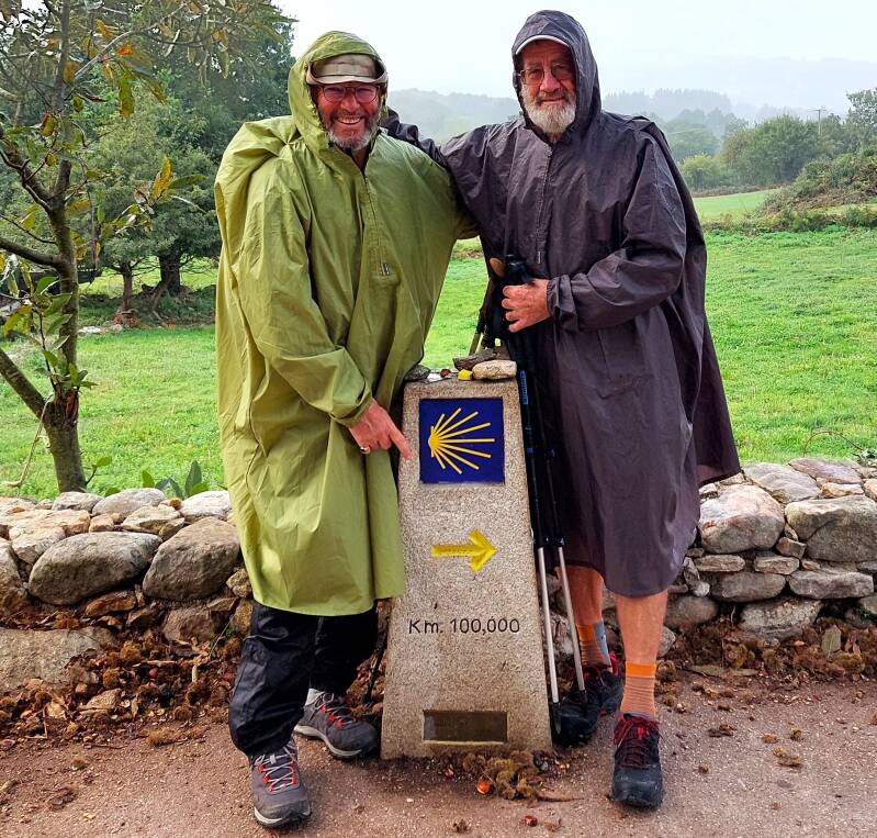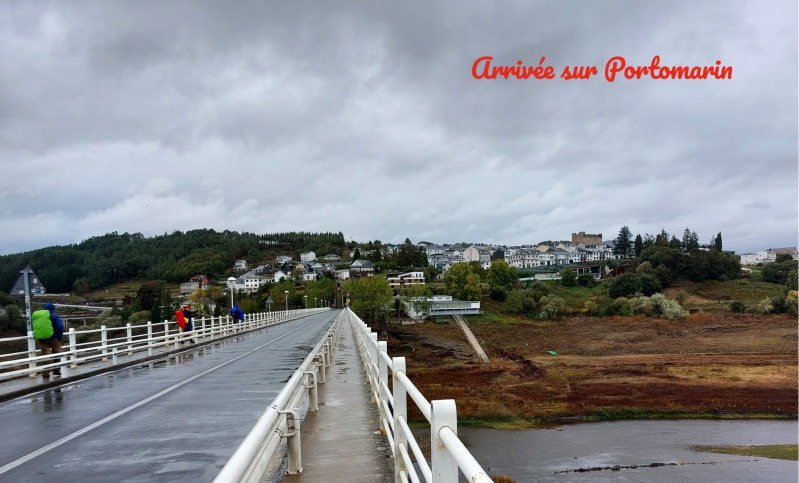 Comme avant-hier, il a pas mal plu dans l’après-midi, mais les chaussures ont quand même séché et ce matin nous pouvons les renfiler pour l’étape du jour. Nous remontons les rues de la ville et juste à la sortie, bingo...la pluie qui s’invite. Heureusement cela ne dure qu’un quart d’heure et ne nous empêche pas de marcher à la lumière de la frontale sur un chemin à travers bois. Le jour se lève quand nous arrivons à Barbadelo. Le Camino Francés continue à la fois sur le bitume et sur des chemins de terre jusqu’à Peruscallo où une auberge à l’entrée nous accueille pour la pause café. Quatre kilomètres après avoir repris la route à hauteur du village de Belante, il nous faut à nouveau capeler les vêtements de pluie bien qu’elle soit légère. Un peu plus loin à A Brea, devant nous plusieurs pèlerins font des photos autour d’une borne. Une fois devant, nous découvrons qu’il s’agit de la borne indiquant qu’il reste 100 km jusqu’à Saint-Jacques de Compostelle et nous prenons comme tout le monde la pause. Pour les dix derniers kilomètres alors que la pluie s’est arrêtée, c’est tout d’abord un chemin qui sinue dans la verte campagne en étant souvent bordé par des châtaigniers ; c’est incroyable, il y en a autant qu’en Ardèche. Une petite route prend ensuite le relais, puis de nouveau un chemin pour arriver à Villachá. Et enfin pour les deux derniers kilomètres effectués sous la pluie, un chemin bitumé qui nous amène au pied du pont de Portomarin que nous empruntons pour entrer dans la ville. Nous n’aurons pas long à marcher pour arriver à l’aire de camping-car où une excellente paella nous attend pour le déjeuner ; merci à nos chères et tendres qui assurent un max. Après la sieste, les nuages sont partis plus loin et le soleil a fait son apparition. Du coup, nous partons visiter la ville et arroser le passage officiel en dessous des 100 kilomètres, avant une soirée calme.
