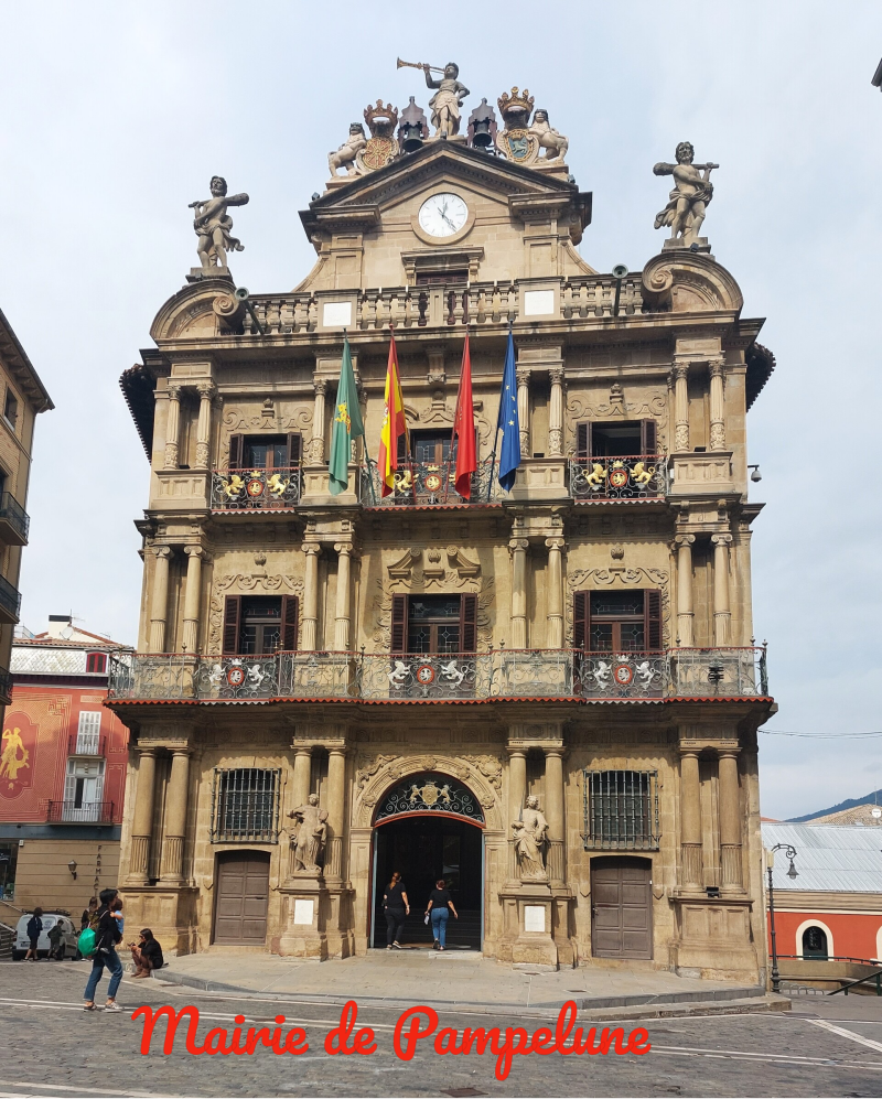 Hier nous sommes redescendus à 500m d'altitude et la température de la nuit a été plus clémente. Ce matin il fait 13° lorsque nous nous préparons à partir. Après une courte montée, le chemin nous fait prendre un sentier puis nous descendons sur Larrasoaña. Nous continuons ensuite à travers champs en suivant la rivière Arga jusqu'à Zabaldika. Juste après le pont situé à l'entrée du village, un bar épicerie pour les pèlerins nous attend. Nous y prenons le café et Jo, qui a oublié de prendre les barres de céréales, y ajoute un petit supplément avec 2 pâtisseries au chocolat. Nous suivons ensuite une route bitumée puis un chemin forestier et au dix-huitième kilomètre nous sommes à Villava Atarrabia. Après avoir traversé à nouveau un joli pont, nous visitons l'iglesia (église) de la Santisima Trinidad. Quelques centaines de mètres plus loin, nous rentrons dans Burlada/Burlata, la banlieue de Pampelune. Là, retour à la civilisation avec de la circulation, des feux tricolores, des bus, de la pollution... que de bruit et d'odeurs ! Heureusement, le balisage du chemin est au top et vers 12h30 nous entrons dans Pampelune par la porte de France de la citadelle. Il y a beaucoup de monde dans les rues et nous entendons de la musique. Pampelune fête San Fermín. Traditionnellement les fêtes ont lieu du 6 au 14 Juillet, mais vous pouvez revivre cette magie à n’importe quelle époque de l’année en vous promenant dans Pampelune. Aujourd'hui c'est le cas avec des peñas (groupe d'amis) et des grosses têtes qui dansent. Devant la cathédrale de Santa Maria la Real de Pampelona, nous retrouvons Pascale et Dominique. Elles sont arrivées ce matin et ont déjà bien arpenté les rues de la vieille ville. Après avoir visité la Cathédrale, nous partons pour un tour dans la ville, passons devant la mairie et nous arrivons ensuite sur la plaza Consistorial. Il est 14 h et nous dégotons un sympathique restaurant avec terrasse pour le déjeuner avec des animations liées à la San Fermin (cracheurs de feu, jeux de bulles géantes...). Vers 16 heures, bien repus, il nous faut repartir pour rentrer à l'aire de camping-car situé à trois kilomètres. La soirée sera calme après cette journée bien remplie.